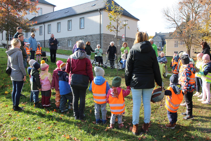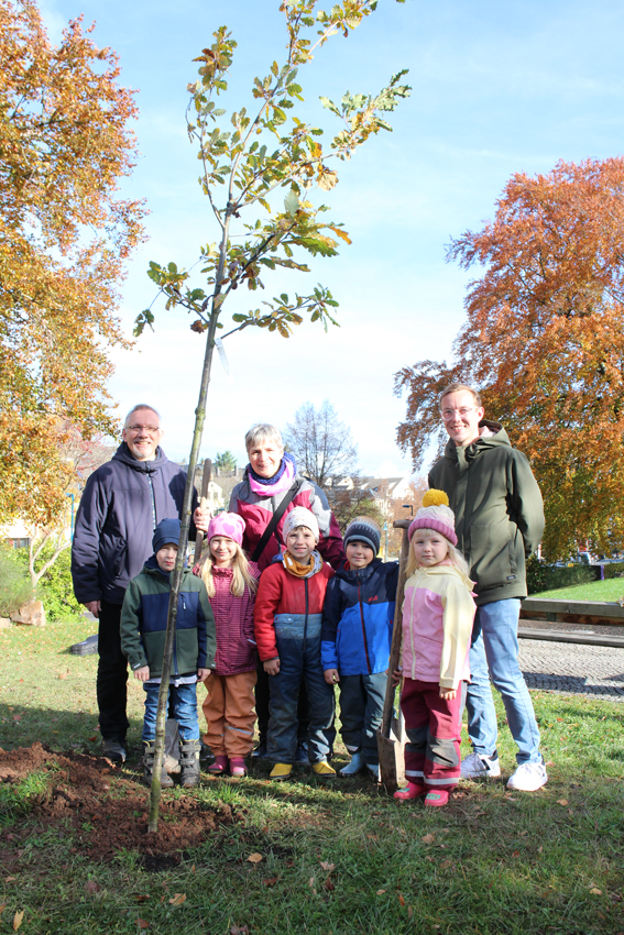 Am Mittwoch kamen viele Kinder aus der AWO-Kita „Rote Schule“ und der Kita „Kastanie“ der Diakonie Erzgebirge, ebenso Bewohnerinnen und Bewohner der Wohnanlage „Drei Erlen“, unser Bürgermeister Thomas Lein sowie weitere Gäste zu diesem schönen Anlass zusammen. Vor der Stadthalle pflanzten wir eine Traubeneiche. Die Kinder sangen mit großer Freude zwei Herbstlieder, während die Sonne warm auf ihre Gesichter schien. Nach den Grußworten von Bürgermeister Lein und Pfarrer Bergmann griffen die Kinder beherzt zu den Schippen und halfen tatkräftig mit. Zum Abschluss bildeten wir einen Kreis um den frisch gepflanzten Baum und wünschten ihm Segen, gutes Wachstum und starke Wurzeln.